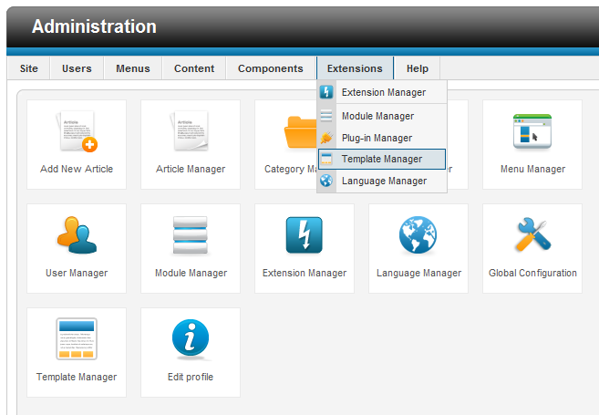 Login to the Administration Control Panel of your Joomla Template. From here navigate to Extentions >> Template Manager
