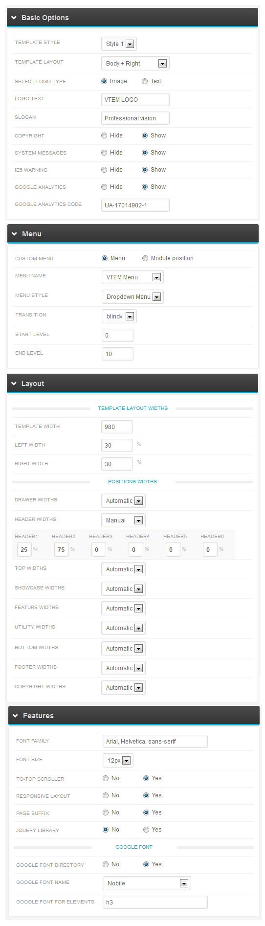 The template comes with template specific parameters. Below is a list of the different parameters and what each does. We suggest you play around with these to get an idea of what you'll need specifically for your Joomla website.