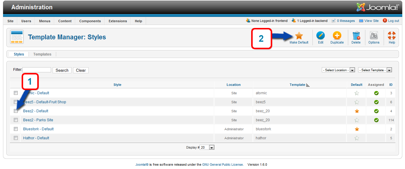 Now navigate to Extensions >> Template Manager. You will see a list of templates installed on your Joomla website. Click the radio button to the left of the template you wish to use. Next click the "Default" icon at the top right of the page. This will append your installed template to the Joomla website.